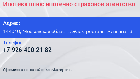Ипотека-плюс, ипотечно-страховое агентство по адресу 144010, Московская область, Электросталь, Ялагина, 3 в дальнейшем Организация, размещена в следующих категориях: