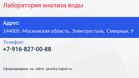 Лаборатория анализа воды по адресу 144005, Московская область, Электросталь, Северная, 9 в дальнейшем Организация, размещена в следующих категориях: