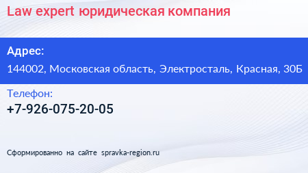 Law expert, юридическая компания по адресу 144002, Московская область, Электросталь, Красная, 30Б в дальнейшем Организация, размещена в следующих категориях: