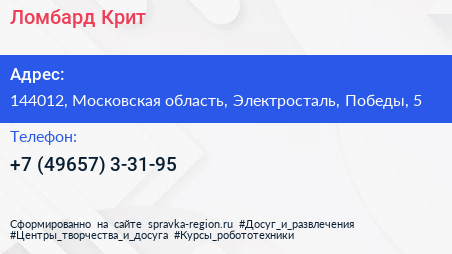 Ломбард-Крит по адресу 144012, Московская область, Электросталь, Победы, 5 в дальнейшем Организация, размещена в следующих категориях: