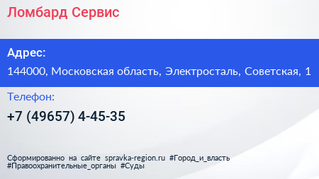 Ломбард-Сервис по адресу 144000, Московская область, Электросталь, Советская, 1 в дальнейшем Организация, размещена в следующих категориях: