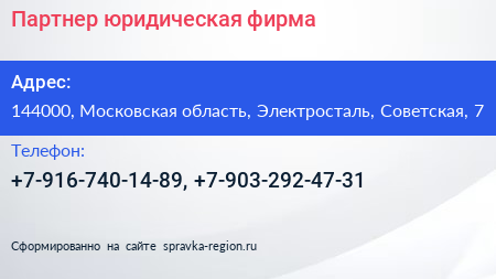 Партнер, юридическая фирма по адресу 144000, Московская область, Электросталь, Советская, 7 в дальнейшем Организация, размещена в следующих категориях: