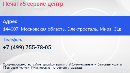 Печати5, сервис-центр по адресу 144007, Московская область, Электросталь, Мира, 31в в дальнейшем Организация, размещена в следующих категориях: