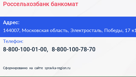 Россельхозбанк, банкомат по адресу 144007, Московская область, Электросталь, Победы, 17 к1 в дальнейшем Организация, размещена в следующих категориях: