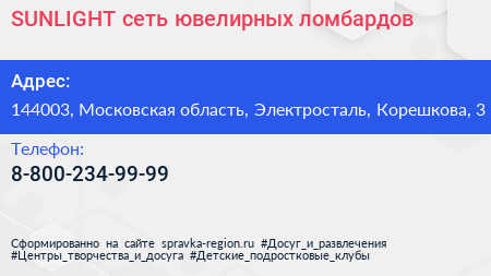 SUNLIGHT, сеть ювелирных ломбардов по адресу 144003, Московская область, Электросталь, Корешкова, 3 в дальнейшем Организация, размещена в следующих категориях: