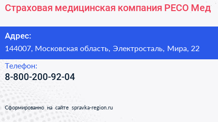 Страховая медицинская компания РЕСО-Мед по адресу 144007, Московская область, Электросталь, Мира, 22 в дальнейшем Организация, размещена в следующих категориях: