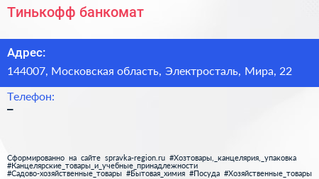 Тинькофф, банкомат по адресу 144007, Московская область, Электросталь, Мира, 22 в дальнейшем Организация, размещена в следующих категориях: