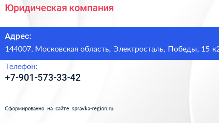 Юридическая компания по адресу 144007, Московская область, Электросталь, Победы, 15 к2 в дальнейшем Организация, размещена в следующих категориях: