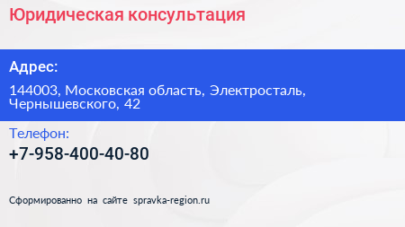 Юридическая консультация по адресу 144003, Московская область, Электросталь, Чернышевского, 42 в дальнейшем Организация, размещена в следующих категориях: