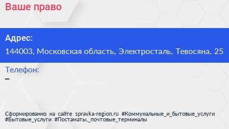 Ваше право по адресу 144003, Московская область, Электросталь, Тевосяна, 25 в дальнейшем Организация, размещена в следующих категориях: