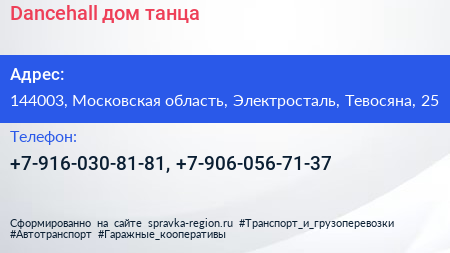 Dancehall, дом танца по адресу 144003, Московская область, Электросталь, Тевосяна, 25 в дальнейшем Организация, размещена в следующих категориях: