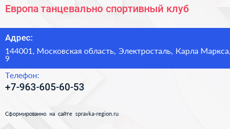 Европа, танцевально-спортивный клуб по адресу 144001, Московская область, Электросталь, Карла Маркса, 9 в дальнейшем Организация, размещена в следующих категориях: