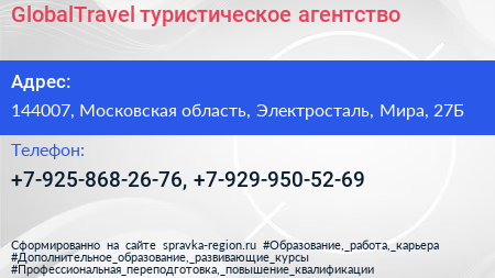 GlobalTravel, туристическое агентство по адресу 144007, Московская область, Электросталь, Мира, 27Б в дальнейшем Организация, размещена в следующих категориях: