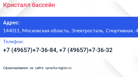 Кристалл, бассейн по адресу 144011, Московская область, Электросталь, Спортивная, 4 в дальнейшем Организация, размещена в следующих категориях: