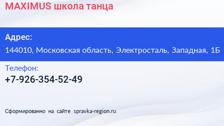 MAXIMUS, школа танца по адресу 144010, Московская область, Электросталь, Западная, 1Б в дальнейшем Организация, размещена в следующих категориях: