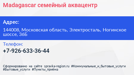 Madagascar, семейный аквацентр по адресу 144008, Московская область, Электросталь, Ногинское шоссе, 36Б в дальнейшем Организация, размещена в следующих категориях: