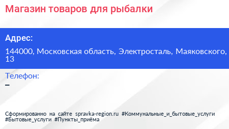 Магазин товаров для рыбалки по адресу 144000, Московская область, Электросталь, Маяковского, 13 в дальнейшем Организация, размещена в следующих категориях: