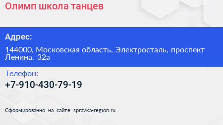Олимп, школа танцев по адресу 144000, Московская область, Электросталь, проспект Ленина, 32а в дальнейшем Организация, размещена в следующих категориях: