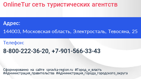 OnlineTur, сеть туристических агентств по адресу 144003, Московская область, Электросталь, Тевосяна, 25 в дальнейшем Организация, размещена в следующих категориях: