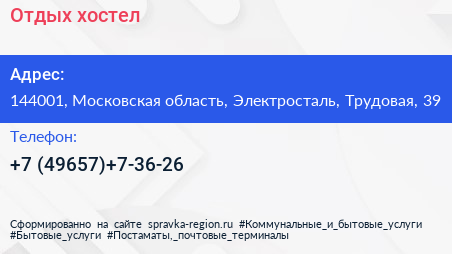 Отдых, хостел по адресу 144001, Московская область, Электросталь, Трудовая, 39 в дальнейшем Организация, размещена в следующих категориях: