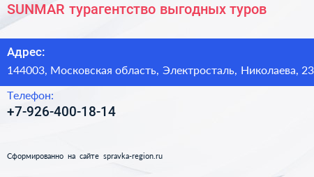 SUNMAR, турагентство выгодных туров по адресу 144003, Московская область, Электросталь, Николаева, 23 в дальнейшем Организация, размещена в следующих категориях: