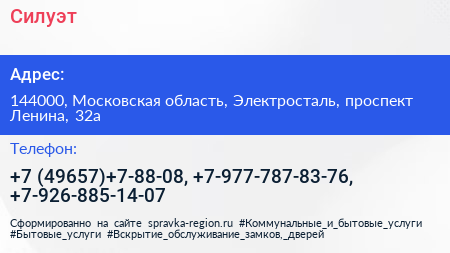 Силуэт по адресу 144000, Московская область, Электросталь, проспект Ленина, 32а в дальнейшем Организация, размещена в следующих категориях: