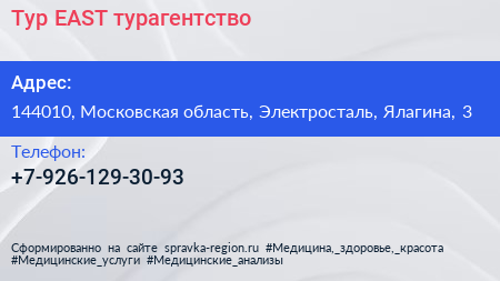 Тур EAST, турагентство по адресу 144010, Московская область, Электросталь, Ялагина, 3 в дальнейшем Организация, размещена в следующих категориях: