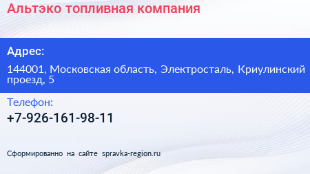 Альтэко, топливная компания по адресу 144001, Московская область, Электросталь, Криулинский проезд, 5 в дальнейшем Организация, размещена в следующих категориях: