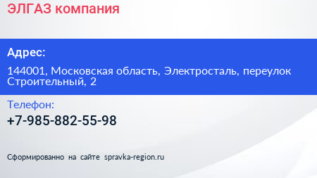 ЭЛГАЗ, компания по адресу 144001, Московская область, Электросталь, переулок Строительный, 2 в дальнейшем Организация, размещена в следующих категориях: