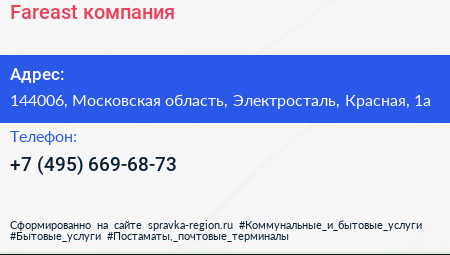 Fareast, компания по адресу 144006, Московская область, Электросталь, Красная, 1а в дальнейшем Организация, размещена в следующих категориях: