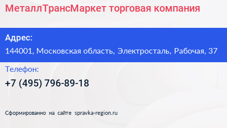 МеталлТрансМаркет, торговая компания по адресу 144001, Московская область, Электросталь, Рабочая, 37 в дальнейшем Организация, размещена в следующих категориях: