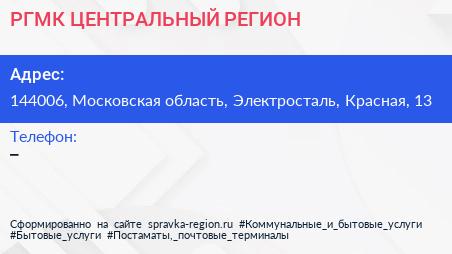 РГМК - ЦЕНТРАЛЬНЫЙ РЕГИОН по адресу 144006, Московская область, Электросталь, Красная, 13 в дальнейшем Организация, размещена в следующих категориях:
