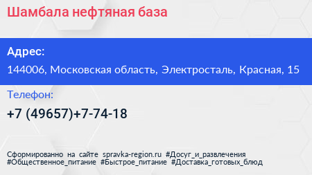 Шамбала, нефтяная база по адресу 144006, Московская область, Электросталь, Красная, 15 в дальнейшем Организация, размещена в следующих категориях: