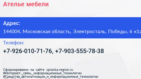 Ателье мебели по адресу 144004, Московская область, Электросталь, Победы, 6 к1а в дальнейшем Организация, размещена в следующих категориях: