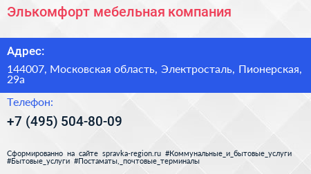 Элькомфорт, мебельная компания по адресу 144007, Московская область, Электросталь, Пионерская, 29а в дальнейшем Организация, размещена в следующих категориях: