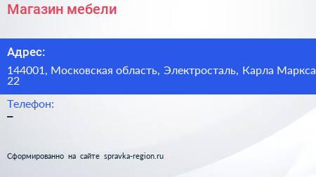 Магазин мебели по адресу 144001, Московская область, Электросталь, Карла Маркса, 22 в дальнейшем Организация, размещена в следующих категориях: