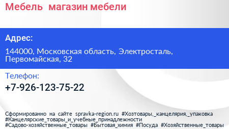 Мебель+, магазин мебели по адресу 144000, Московская область, Электросталь, Первомайская, 32 в дальнейшем Организация, размещена в следующих категориях: