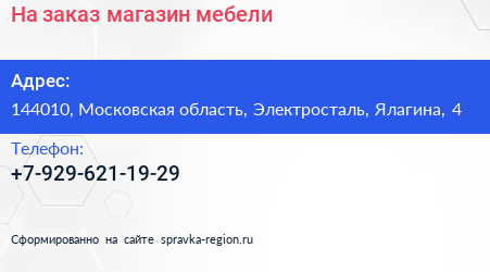 На заказ, магазин мебели по адресу 144010, Московская область, Электросталь, Ялагина, 4 в дальнейшем Организация, размещена в следующих категориях: