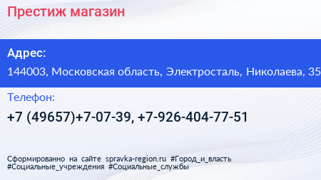 Престиж, магазин по адресу 144003, Московская область, Электросталь, Николаева, 35 в дальнейшем Организация, размещена в следующих категориях: