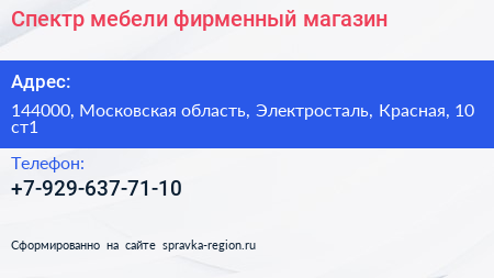 Спектр мебели, фирменный магазин по адресу 144000, Московская область, Электросталь, Красная, 10 ст1 в дальнейшем Организация, размещена в следующих категориях: