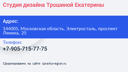 Студия дизайна Трошиной Екатерины по адресу 144005, Московская область, Электросталь, проспект Ленина, 25 в дальнейшем Организация, размещена в следующих категориях: