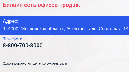 Билайн, сеть офисов продаж по адресу 144000, Московская область, Электросталь, Советская, 14 в дальнейшем Организация, размещена в следующих категориях: