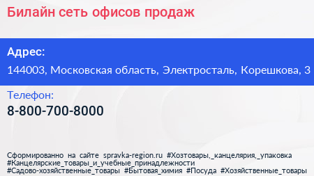 Билайн, сеть офисов продаж по адресу 144003, Московская область, Электросталь, Корешкова, 3 в дальнейшем Организация, размещена в следующих категориях:
