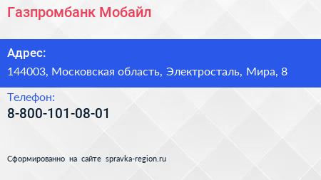 Газпромбанк Мобайл по адресу 144003, Московская область, Электросталь, Мира, 8 в дальнейшем Организация, размещена в следующих категориях: