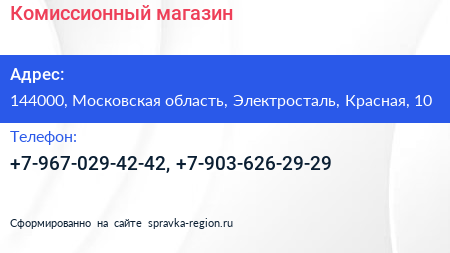 Комиссионный магазин по адресу 144000, Московская область, Электросталь, Красная, 10 в дальнейшем Организация, размещена в следующих категориях: