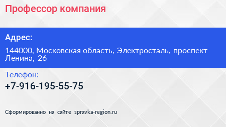 Профессор, компания по адресу 144000, Московская область, Электросталь, проспект Ленина, 26 в дальнейшем Организация, размещена в следующих категориях: