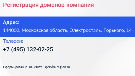 Регистрация доменов, компания по адресу 144002, Московская область, Электросталь, Горького, 14 в дальнейшем Организация, размещена в следующих категориях: