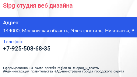 Sipg, студия веб-дизайна по адресу 144000, Московская область, Электросталь, Николаева, 9 в дальнейшем Организация, размещена в следующих категориях: