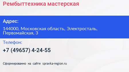Рембыттехника, мастерская по адресу 144000, Московская область, Электросталь, Первомайская, 3 в дальнейшем Организация, размещена в следующих категориях: