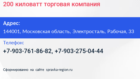 200 киловатт, торговая компания по адресу 144001, Московская область, Электросталь, Рабочая, 33 в дальнейшем Организация, размещена в следующих категориях:
